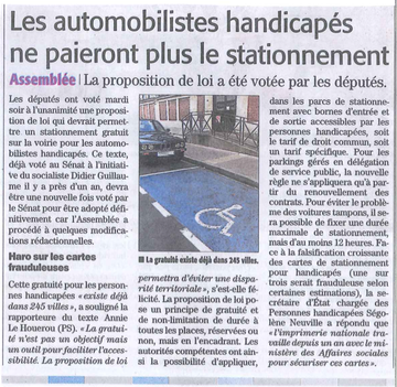 Cette gratuité pour les personnes handicapées « existe déjà dans 245 villes », a souligné la rapporteure du texte Annie Le Houerou (PS). « La gratuité n’est pas un objectif mais un outil pour faciliter l’accessibilité. La proposition de loi permettra d’éviter une disparité territoriale », s’est-elle félicité. La proposition de loi pose un principe de gratuité et de non-limitation de durée à toutes les places, réservées ou non, mais en l’encadrant. Les autorités compétentes ont ainsi la possibilité d’appliquer soit le tarif de droit commun, soit un tarif spécifique.