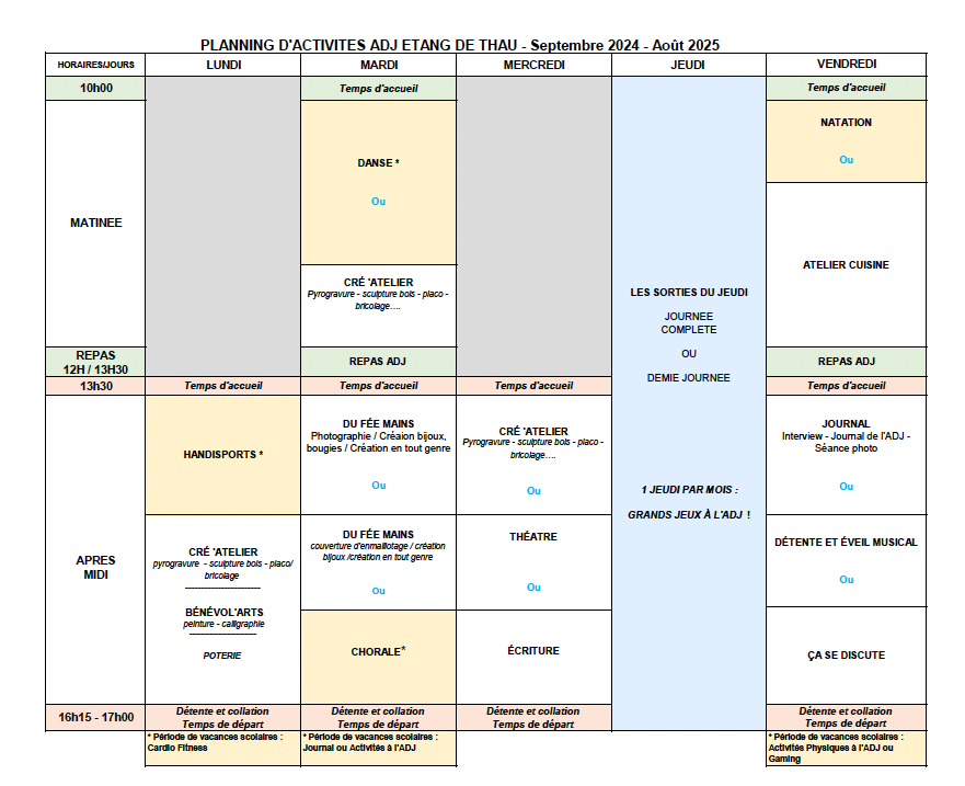 - les jeudis de 10h à 17h ou de 13h30 à 17h (en fonction des activités / sorties)..